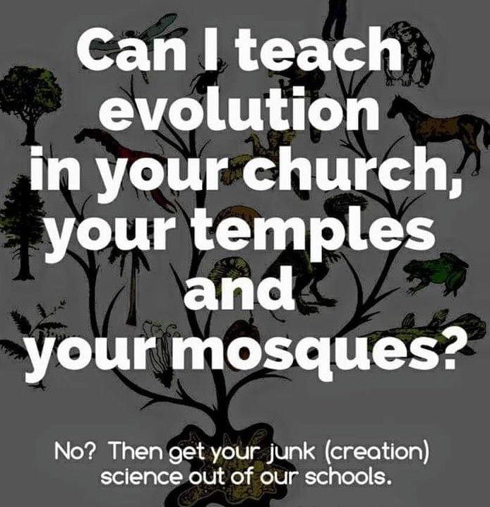 First error is assuming there is an equivalency between private religious institutions like churches and mosques, and publicly funded ones like public schools. There is a major, constitutional difference in this country. The way the Supreme Court has ruled, religion may not be compelled by the government. What this means in practice is that all instruction must be religiously neutral. Of course, this gets violated all the time, mostly by introducing Hindu meditation, Islamic prayers, or pagan spirituality. Atheists never seem to care much about these, and in fact, celebrated when a Christian student lost her suit to avoid being forced to write out the Islamic conversion prayer in a public school in Maryland. However, by definition, no instruction is religiously neutral. Atheism is a religion. Any commentary on origins will, by definition, go into religious territory.