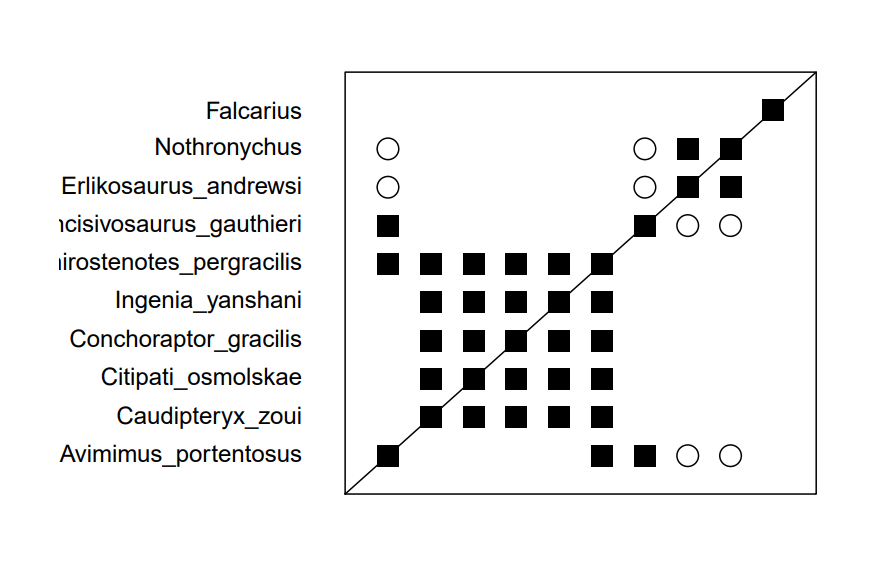 We have been walking through McLain et al (2018) and their attempt to put feathers on dinosaurs using statistical baraminology. So far, we have made it to figures 30 and 31. In previous parts, we’ve seen some indeterminate results, as well as some baraminologically untenable results. In this part, we will look at a very small subset of the data, in imitation of McLain et al. In this one, they broke the Brusatte dataset down to just two groups: Therizinosaurs and Oviraptorosaurs. In this group there were just ten taxa. Only 68 characters were used for analysis out of 860.