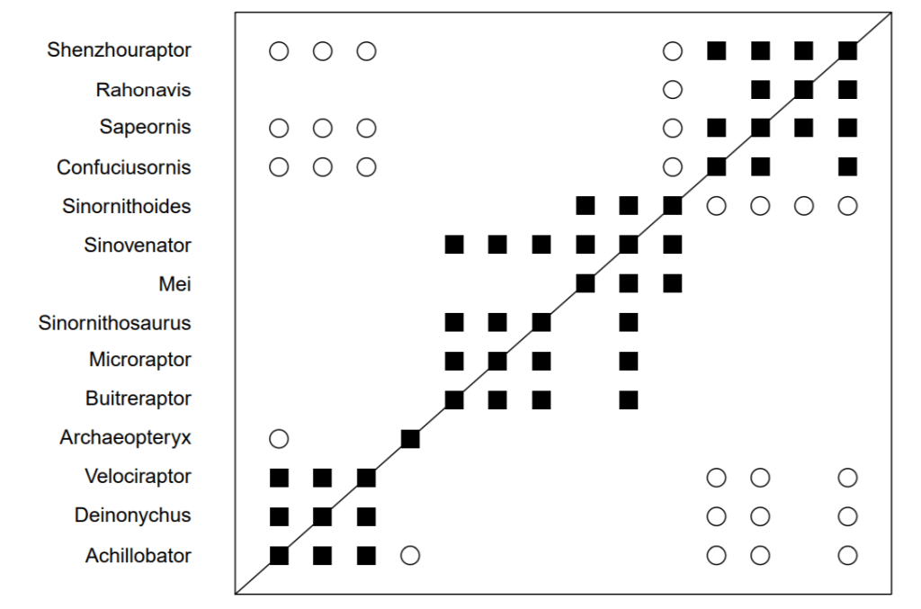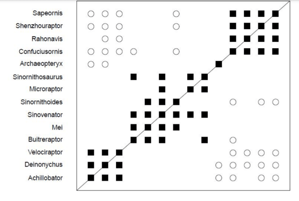 As usual, the first step was to determine bootstrapping values as these were not reported in the paper. The group we examined this week is the Paraves subset of the Lee dataset,exactly as run by McLain et al. Fourteen taxa were used, with a total of 277 characters retained for analysis at 75% relevance. Bootstrapping values were decent with quite a few in the mid 90s to 100 range. However, a few were quite poor, in the 40s and 50s. Given at least a few bootstrapping values were poor, it raises questions about how good the data is. Again I have to ask why this important step in the method was completely ignored? I understand that the paper was monstrous, but an additional paragraph or sentence explaining bootstrapping values, or why the authors elected to not report them, would not have hurt.