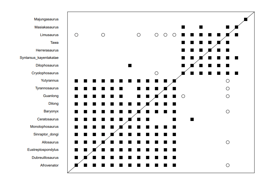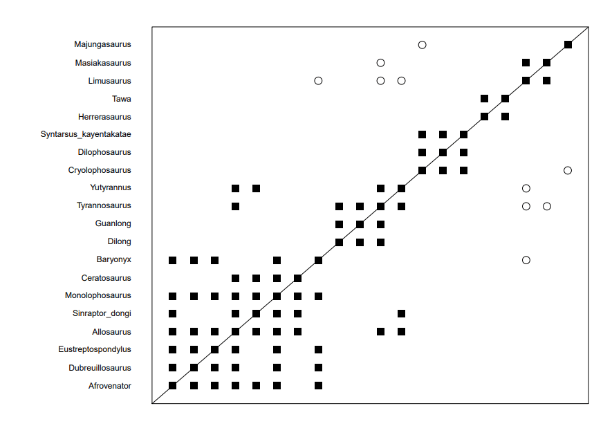Just as a side bar, I tested both of these at 85 and 95% character relevance. Both worked, and produced radically different results. What this tells me is having an arbitrary cut off value makes BDISTMDS/BARCLAY absolutely worthless. I could argue that T rex is related to Allosaurus, or not related to Allosaurus depending on which cut off I chose. The system is completely arbitrary, never mind the veneer of statistical rigor, and that makes it worthless.